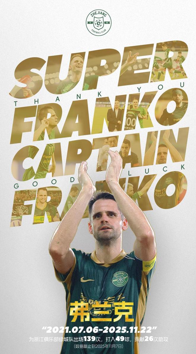 12月4日,体坛周报记者王晓瑞援引了克罗地亚记者泽利科-扬科维奇对前浙江队队长弗兰克的采访,球员还想踢中超。当被问及一步计划,弗兰克表示:之前我觉得要和浙江队说再见了,他们宣布不和我续约。我也没太在意,天下没有不散的宴席。我带着喜悦离开,正值职业生涯巅峰。我在克罗地亚和世界另一端中国都证明了自己,我很满足,目前没有计划,一切交给上帝。我享受美好时光,很珍惜中国球迷发来的每一条祝福和每一份感激之情。