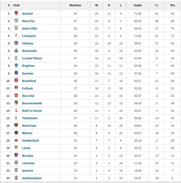 2025年英超所有比赛全部战罢,在年度积分榜上,阿森纳以83分位居榜首,曼城以80分排名第二,维拉位列第三,利物浦排名第四。