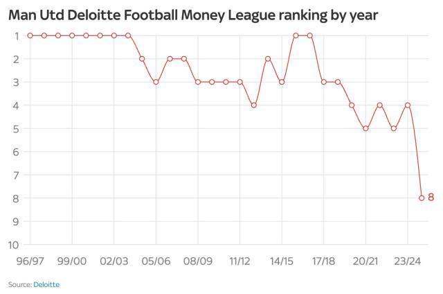 弗格森退休后,曼联经过多年“努力”,获得了“人傻钱多”的标签,但现在钱还多不多真要另说了。最近公布的德勤足球金钱联赛排名,曼联上季收入跌到了历史最低的第8,排在利物浦、曼城和阿森纳之后。曼联曾被视为足球商业成功的典范,在迄今的29届金钱联赛榜中10次位居榜首,但最近一次登顶已经是2017年了。